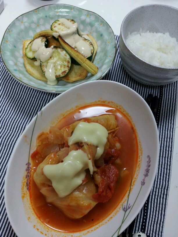①ロールキャベツ(昨日のミネストローネの残りで)