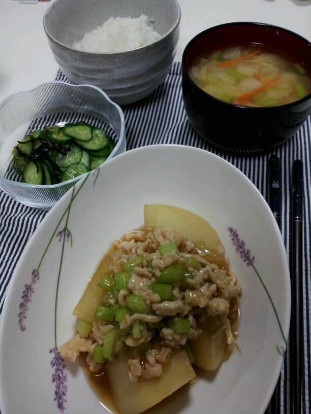 ①かぶの鶏そぼろ(葉っぱも捨てずに彩り)