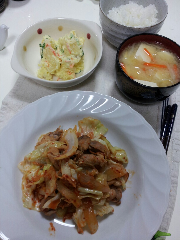 豚キムチはキャベツとタマネギを加えて野菜たっぷりめに。