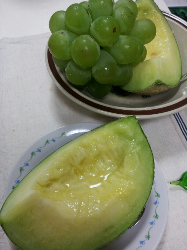 今日実家の母からメロンとマスカットをもらった。