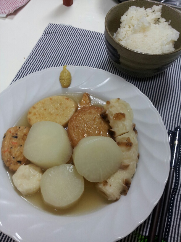 簡単に大根切って、茹で卵つくって、練りモノはまとめてかっていたので、