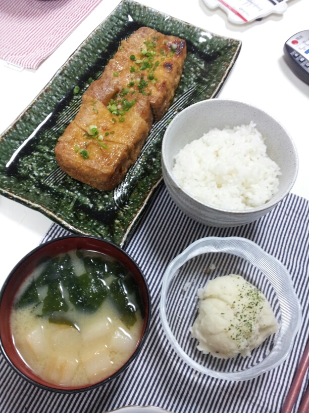 お揚げは冷凍していた厚さたっぷりの厚揚げ。