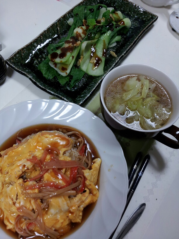 天津飯とこのシンプルチンゲン菜の組み合わせは我が家の定番!