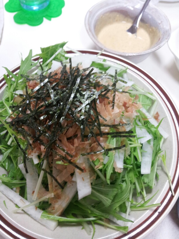 水菜と大根を和風で。かつおぶしと海苔をトッピング。