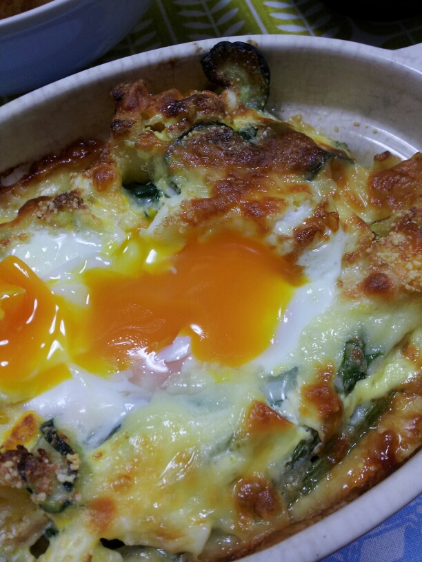 ほうれん草のココットは真ん中に卵を割り入れてマヨとかチーズとか乗っけて