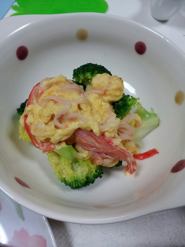 ブロッコリーは茹でておいて、少し濃いめの中華風に味付けしたカニ玉を